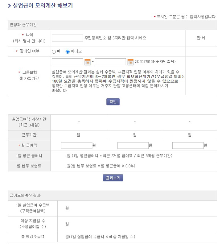 실업급여 모의 계산은 사용자가 입력한 최소한의 정보(고용보험 가입기간과 월 급여액)를 토대로 계산되므로,