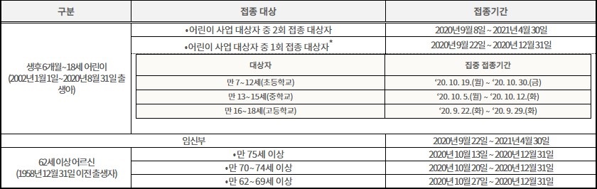 - 단, 과거 2회 이상 인플루엔자 예방접종했던 어린이들은 9월 22일(화)부터 실시 예정.