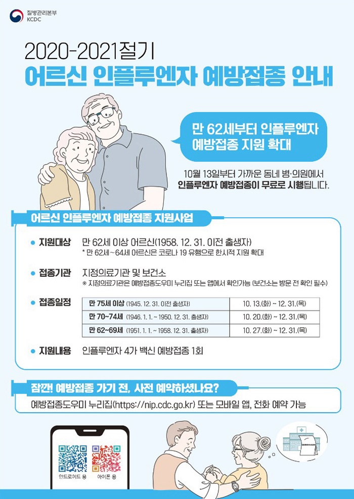 인플루엔자 무료 예방접종하러 가시기 전에 전화예약이나 모바일 앱, 아래 예방접종 도우미 누리집 사이트를 통해 사전 예약후 방문하세요.