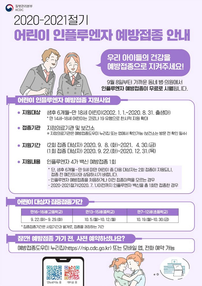 - 단, 과거 2회 이상 인플루엔자 예방접종했던 어린이들은 9월 22일(화)부터 실시 예정.