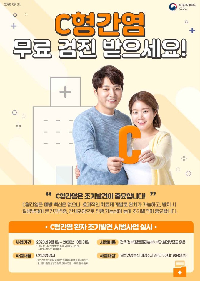 c형간염 예방접종 시범사업은 만 56세(1964년생) 대상으로 국가 건강검진체계를 활용해 2020년 9월 1일부터 10월 31일까지 2개월간 한시적으로 수행될 예정입니다.