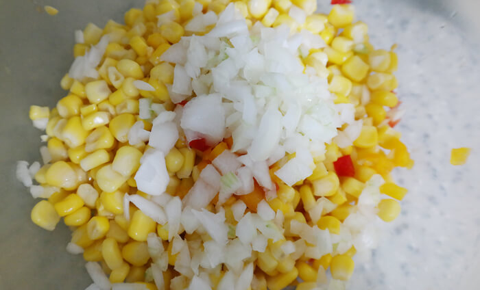 옥수수 통조림과 양파와 파프리카도 다져서 준비해줍니다.