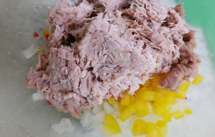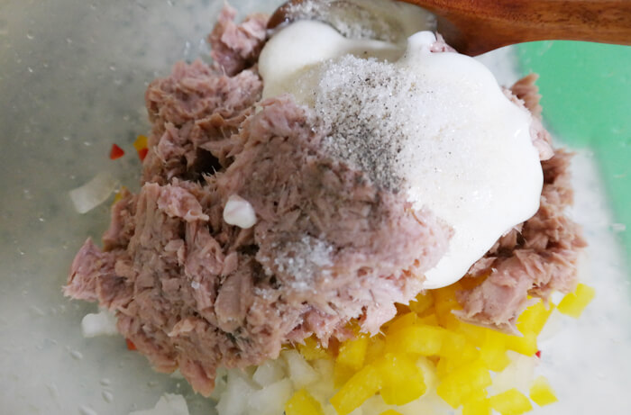 준비해놓은 참치와 함께 마요네즈, 소금, 후추, 설탕을 넣고 버무려 줍니다.